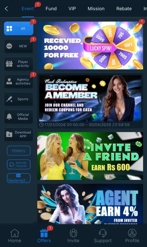 Daily bonuses, welcome offers, and referral rewards.